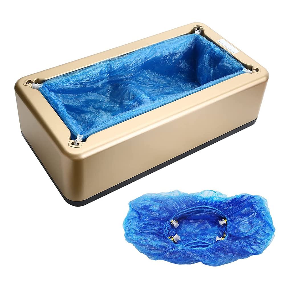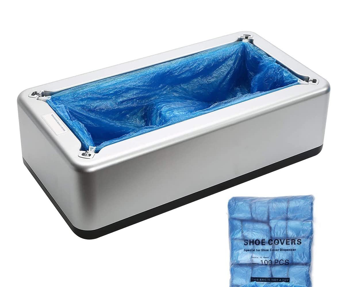 - INNOVATIVE DESIGN: Automatic shoe cover dispenser works on a spring mechanism, so there’s no need to connect it to power source to use. It will automatically release a bootie around your shoe when you stand up the center of the dispenser. It will quickly and efficiently cover the shoes easier.